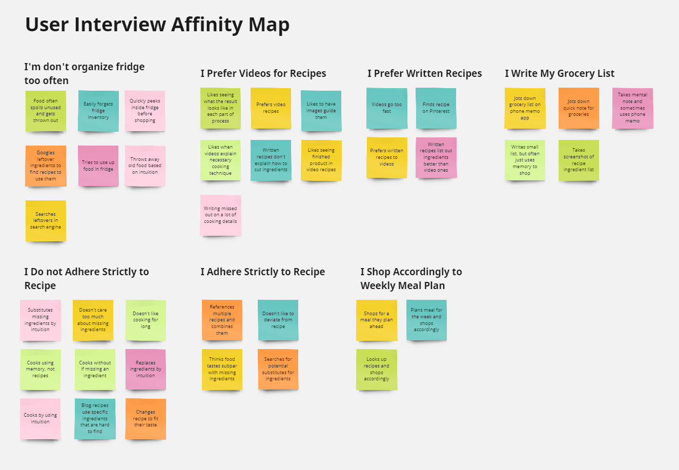 8 adults of varying ages between 25-60 were interviewed in person, and the responses from the interview were organized into an affinity map.