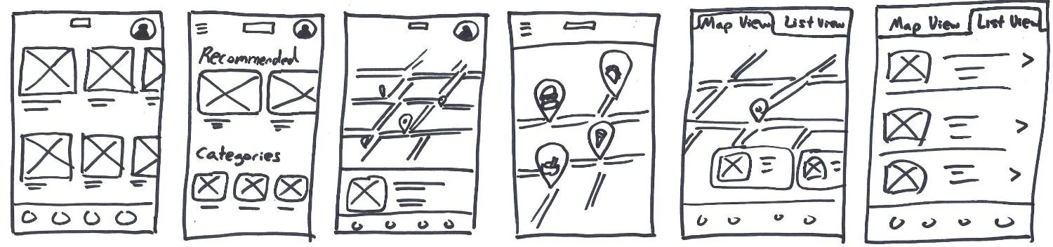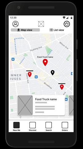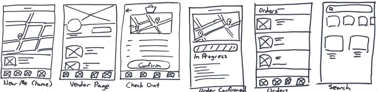 Paper wireframes were drafted with the goal of satisfying our users’ need to easily locate nearby food trucks. The home screen was set as a map view of nearby trucks so users can browse them easily. The checkout and confirmation process were made with the same idea in mind by including a map pinned with user’s location and truck’s location.